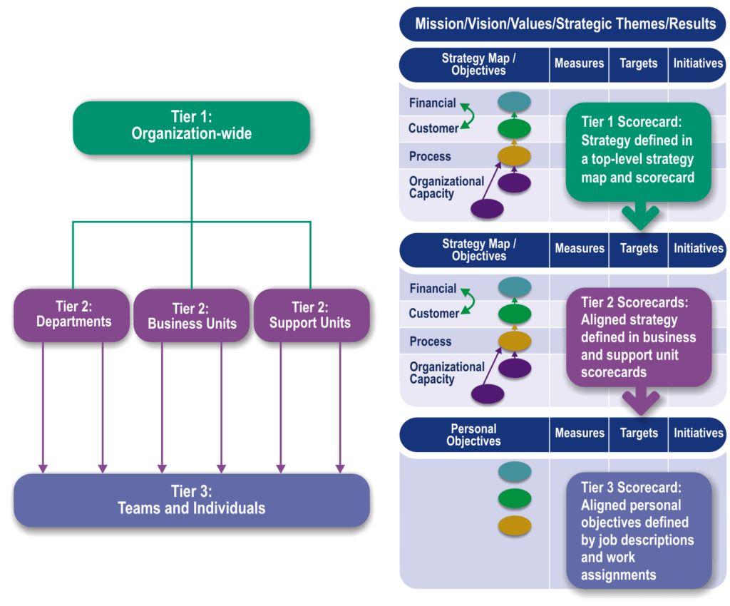 In the Alignment step, strategy is transformed from something only executives worry about to something everyone supports by cascading high-level enterprise strategy to first business and support units and then to individual employees. The Alignment step produces scorecards for business and support units, and individual scorecards for each employee or team.