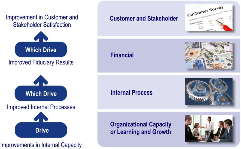 Drs. Robert Kaplan and David Norton found in their initial work together that too many organizations were measuring their success only from a financial point of view and that a broader, more strategic set of dimensions was needed. The success of few strategies can be measured from only one point of view. The basic four perspectives enables the organization to use a strategy map to articulate to employees how value is created by the organization.